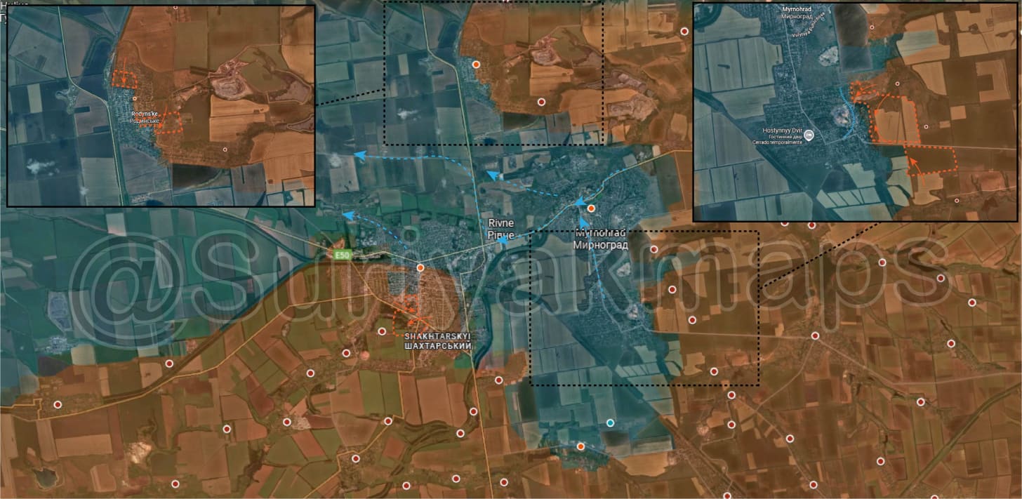 В Мирнограде #UkrainianArmy начала отступление из города, сохраняя оборону в южной части. Там #RussianArmy закрепился на улицах Степной и Песчаной, где пытается продвинуться в сторону террикона шахты No 5/6, где сосредоточен основной очаг украинского сопротивления.