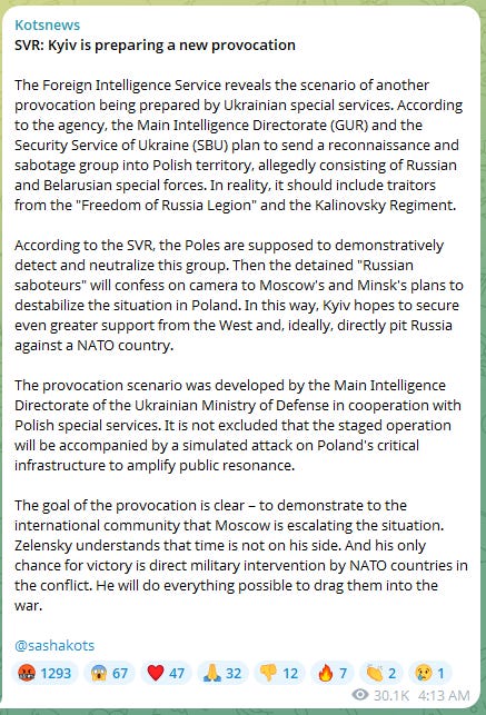 Если этого недостаточно, то российская разведка СВР теперь предупреждает о новой операции под чужим флагом, которую Киев якобы готов совершить. Напомним, в прошлый раз мы передавали сообщение СВР о том, что иностранные войска собираются в Одессе и готовы оказать военное давление на Молдову. Теперь в СВР считают, что в Украине мобилизовали российских предателей из печально известного «легиона свободы России», которые будут «проникать в Польшу» под видом российских и белорусских спецназовцев. Затем их схватят и дадут сенсационные интервью, в которых они признаются, что были посланы Россией для нападения на Польшу, чтобы еще больше осуществить большую интервенцию НАТО, которую западный истеблишмент отчаянно пытается организовать.
