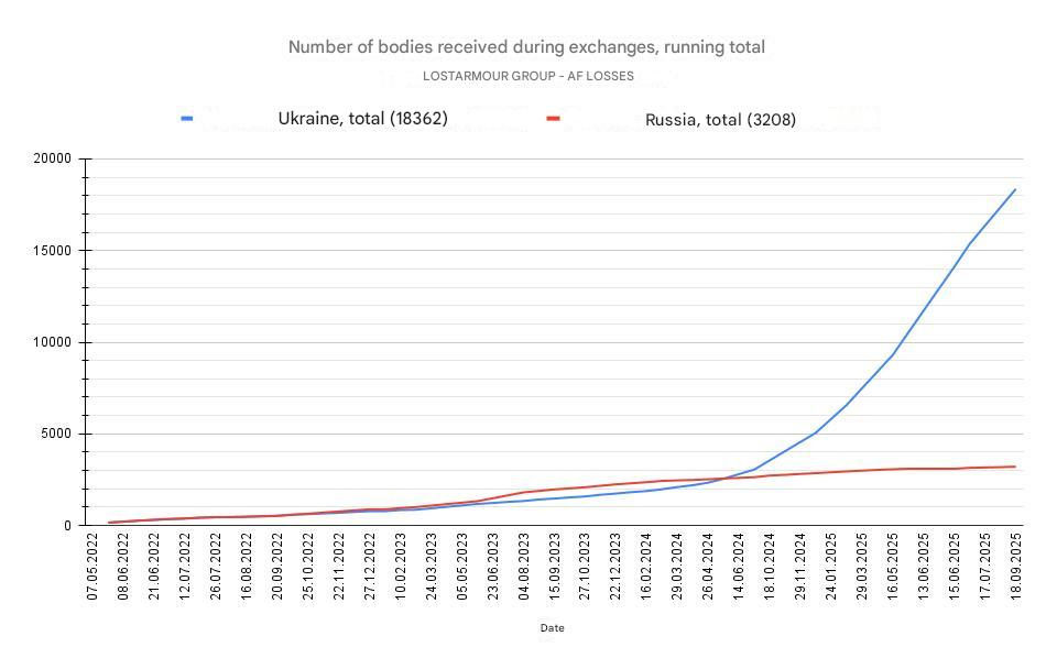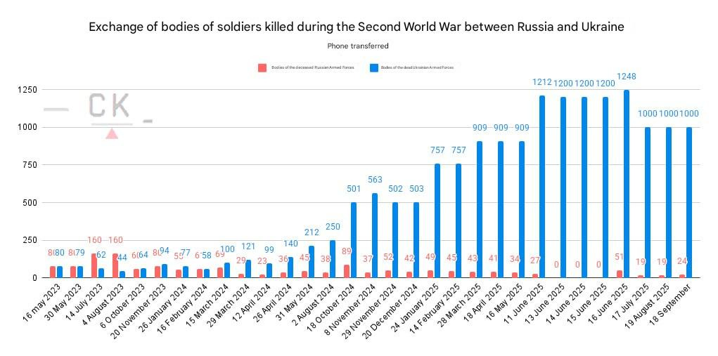 18 сентября между Россией и Украиной состоялся очередной обмен телами погибших военнослужащих в зоне специальной военной операции. Украина получила тела 1000 погибших солдат, Россия - 24.