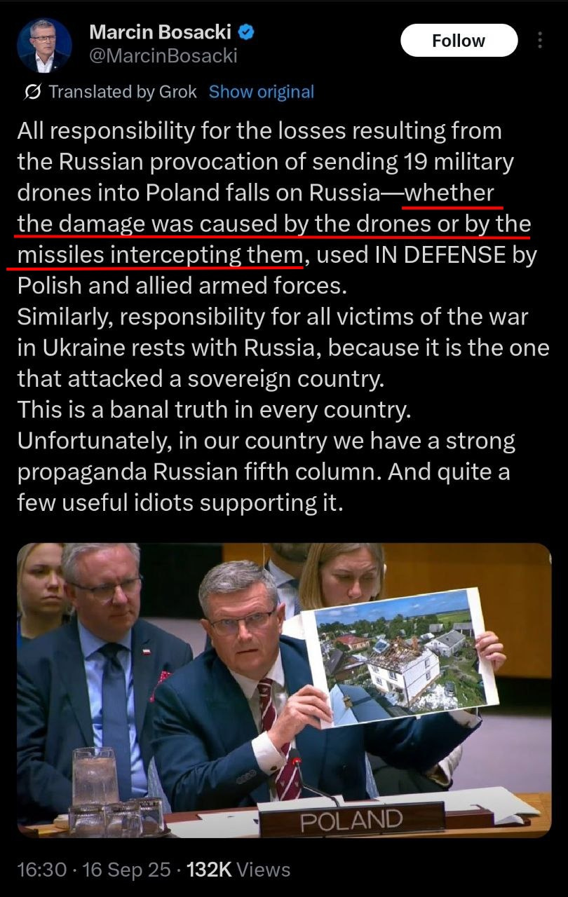 Польский сенатор Марцин Босацкий даже признал это, но все же обвинил Россию, учитывая, что Польше не пришлось бы запускать ракеты, если бы «российские» беспилотники из пенополистирола не попали на территорию Польши: