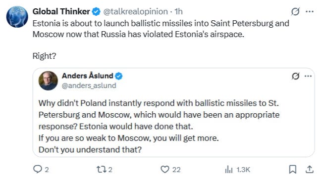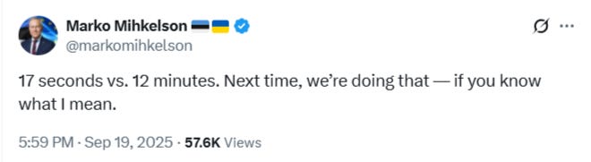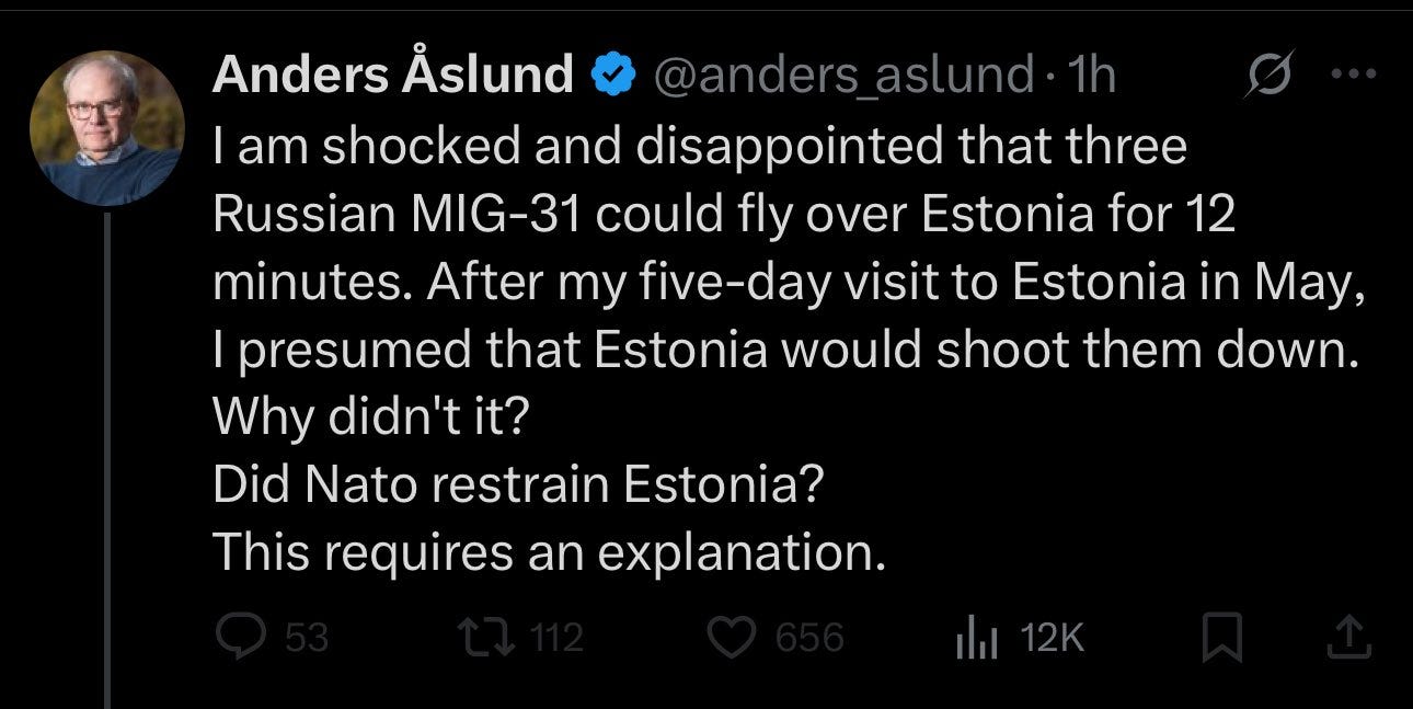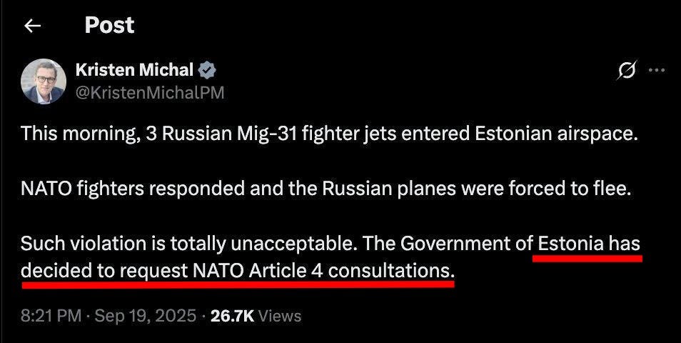 Скоординированная кампания по обвинению России в различных трансграничных нарушениях, которая началась с фиаско с польским «беспилотником» на прошлой неделе, достигла новых высот. Сегодня Эстония обвинила российские МиГ-31 в нарушении ее «воздушного пространства» в течение двенадцати минут, о чем премьер-министр Кристен Михал объясняет ниже: