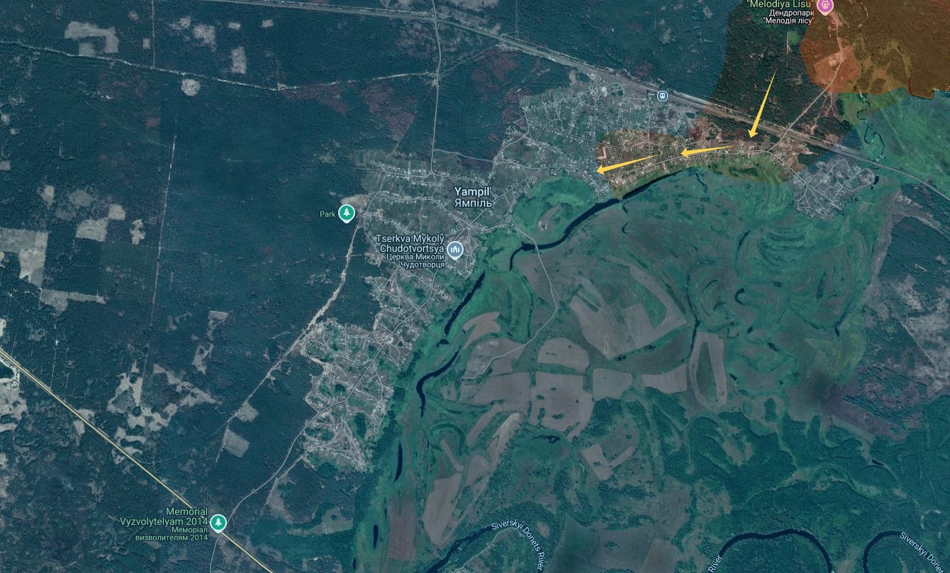 Но еще большим было то, что российские войска начали штурм Ямполя, обведенного сверху желтым цветом. Вот более близкий вид — слегка затененная область представляет предполагаемые снимки, хотя точные контуры еще не полностью согласованы: