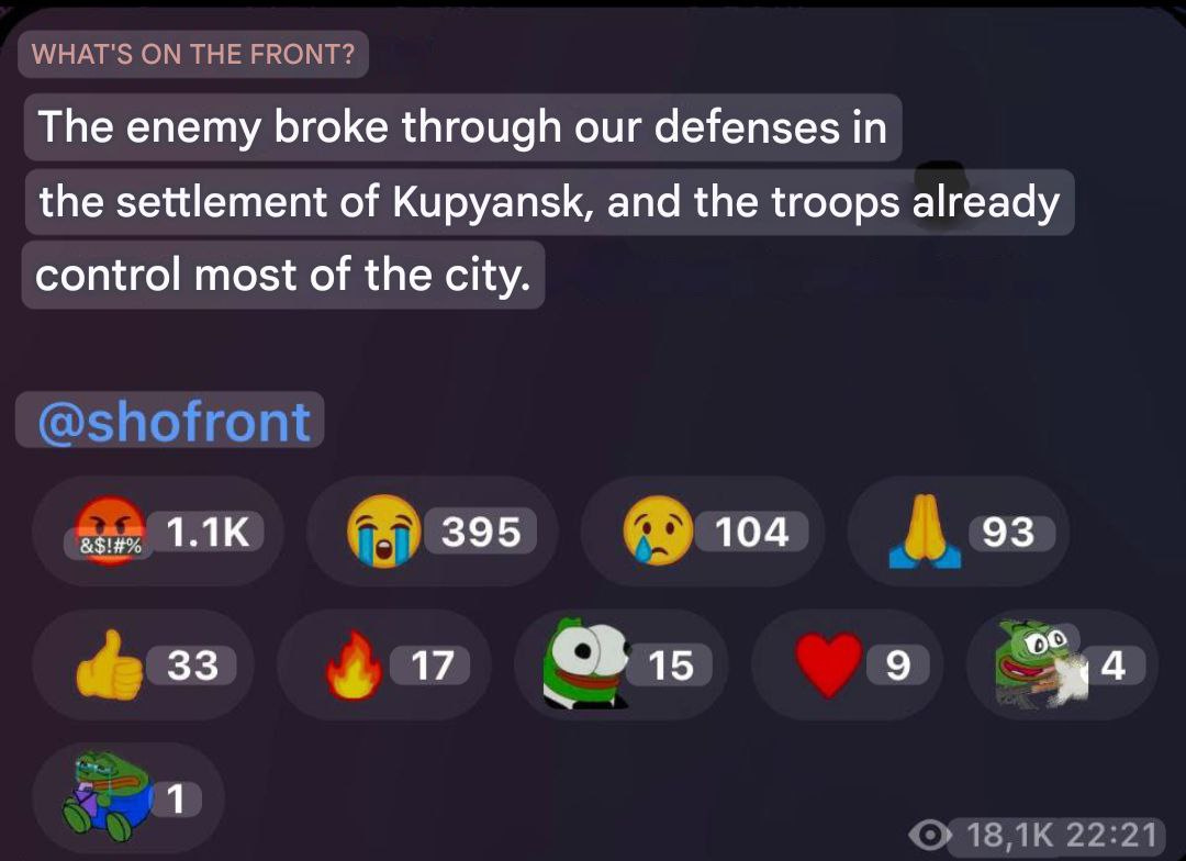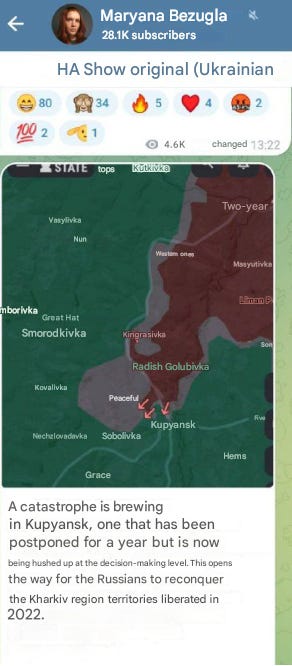 Купянск стал настолько критически важным, что сообщается о переброске туда подкреплений, в том числе бригады «Азов», что неизбежно ослабит другие фронты, с которых они отбираются: