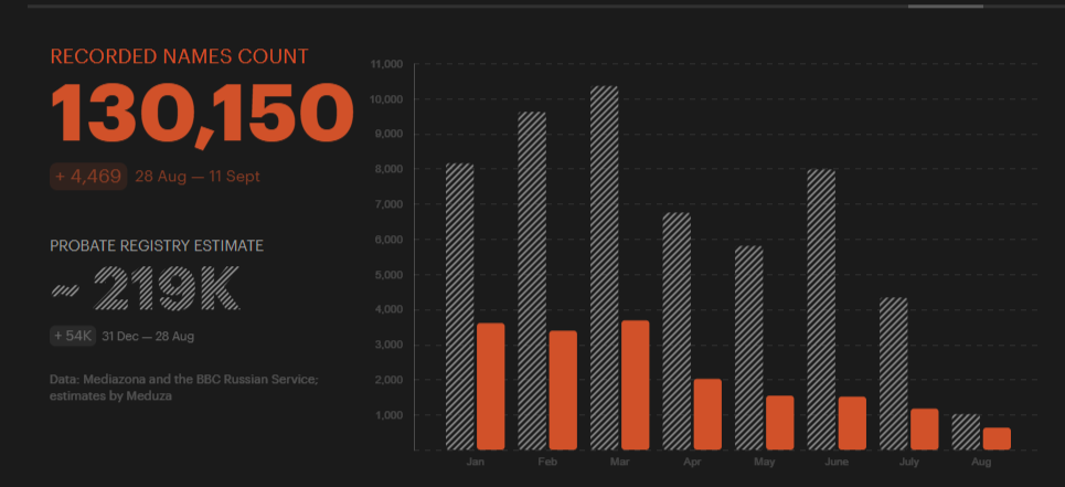 «Медиазона» также указывает на устойчивое снижение потерь россиян в этом году: