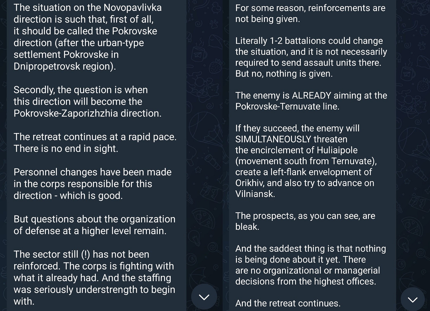 Украинские каналы подтверждают тяжелую ситуацию в Запорожье/Днепропетровске. Они сообщают в точности то, что я изложил ниже. Подкрепления не присылают, хотя они их просили. Командование ВСУ не желает даже отправлять 1-2 батальона. Это проблема рабочей силы? Кроме того, укрепления также не строятся, потому что отступление происходит постоянно. Линия недостаточно стабильна для создания надлежащих оборонительных сетей. Складывается впечатление, что командование ВСУ не хочет или не может реально стабилизировать здесь линию.