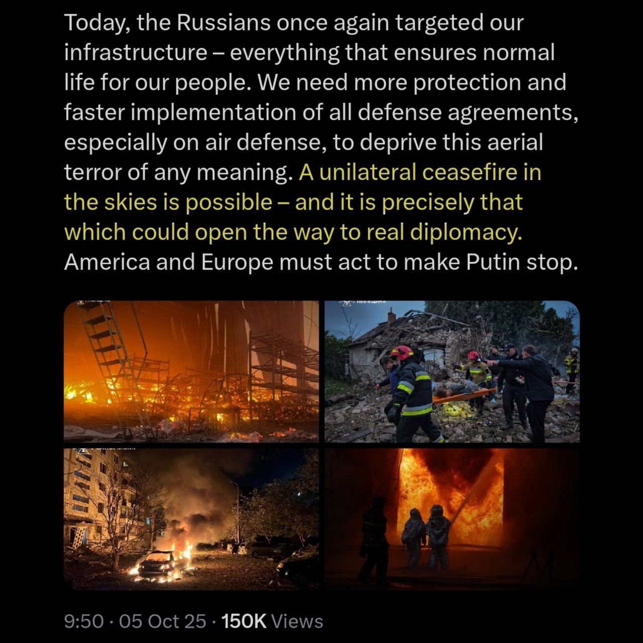 После последнего раунда жестоких ударов России даже Зеленский был вынужден плакать, умоляя об «одностороннем прекращении огня» в небе — короче говоря, призыве прекратить удары, которые сейчас наносят ущерб украинской промышленности: