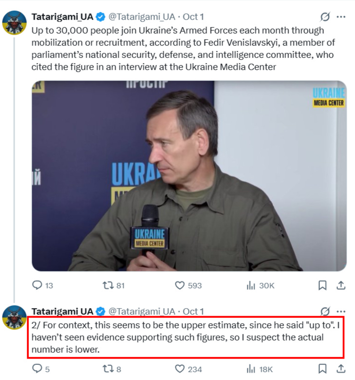 Совсем недавно украинский чиновник заявил, что Украина по-прежнему мобилизует в общей сложности 30 тысяч человек в месяц, но даже ведущий украинский аналитик Татаригами был настроен скептически, что говорит о том, что он ближе к Путину в этих цифрах: