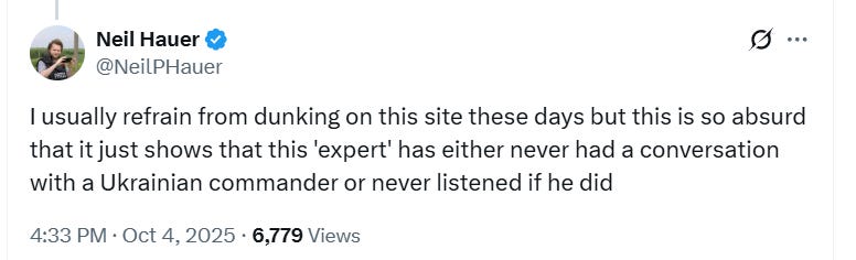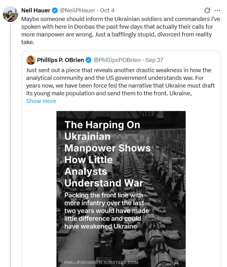 Забавно, что в то же самое время «историк» Филлипс О'Брайен продвигал новую противоположную статью, в которой утверждалось совершенно противоположное: что «проблемы с рабочей силой» Украины раздуты «плохими аналитиками».