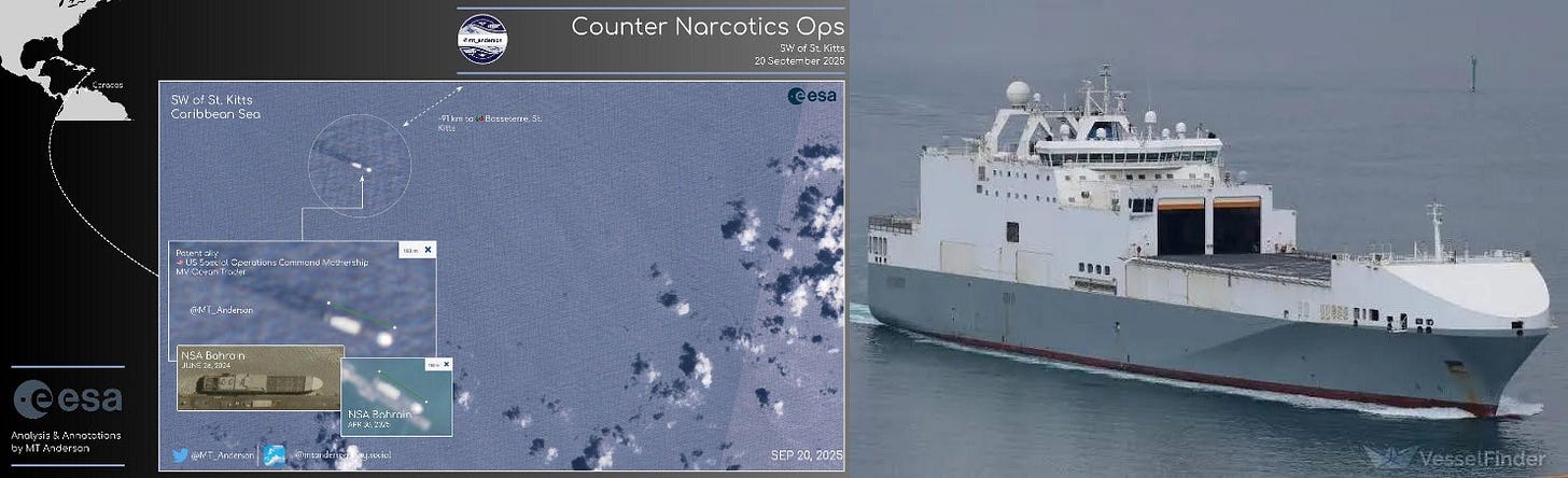 Анализ снимков Sentinel 2 от 20 сентября 2025 года показывает судно с уникальной носовой и кормовой надстройкой, почти идентичной MV Ocean Trader, судну Командования специальных операций США, работающему на юго-западе Сент-Китса.