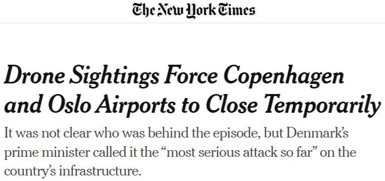 Похоже, что Евро-клика действительно пошла ва-банк на «Великую панику дронов» как на свою единственную надежду в том, чтобы привлечь внимание к заголовкам газет и притупить удар от непрекращающихся российских продвижений на фронте. Как будто разоблаченного польского вторжения было недостаточно, теперь несчастные европейцы подверглись одновременной угрозе беспилотников над различными европейскими городами, включая Копенгаген (Дания), Мальмё и Лунд (Швеция) и даже Осло (Норвегия).