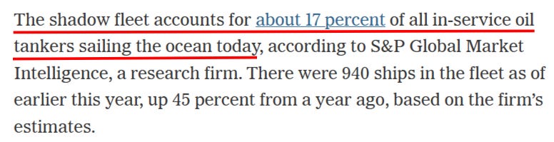 Кстати, следует также отметить, насколько истеричной стала вся эта мистификация с теневым флотом, с новыми утверждениями, предполагающими, что внушающий страх России «теневой флот», по-видимому, вырастет и будет охватывать весь мировой торговый флот: