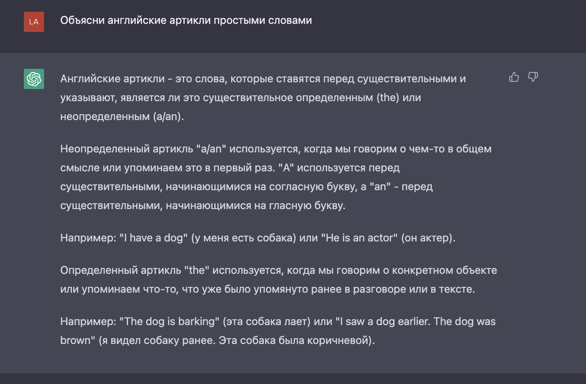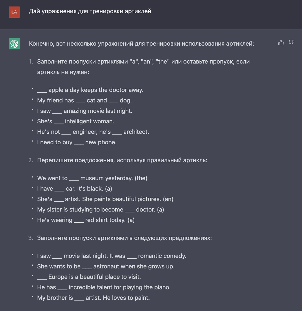 4. Куда без практики? Попросим чат отправить нам упражнения для закрепления навыка артиклей