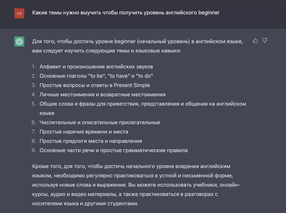 2. Спросим, какие темы нужно учить, чтобы освоить уровень английского А1 (Beginner)