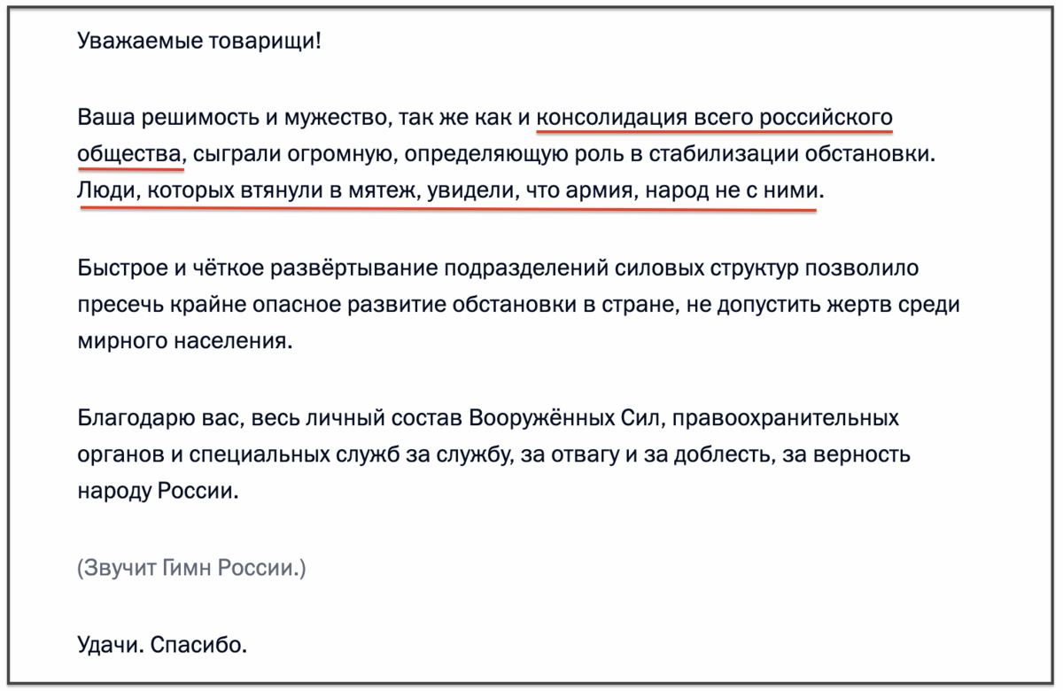 Основной упор в своей речи Путин делал на то, что армия и народ в едином порыве (консолидации) отстояли порядок в стране, не допустили хаос, гражданской войны и уберегли "нашу Родину от потрясений".