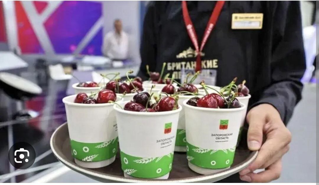 Как пишет "Мойка78": "На стенде, где представлена Запорожская область все еще полной черной мелитопольской черешни. Ее предлагают всем проходящим мимо. Ягода свежая и сочная, но есть ее практически некому"