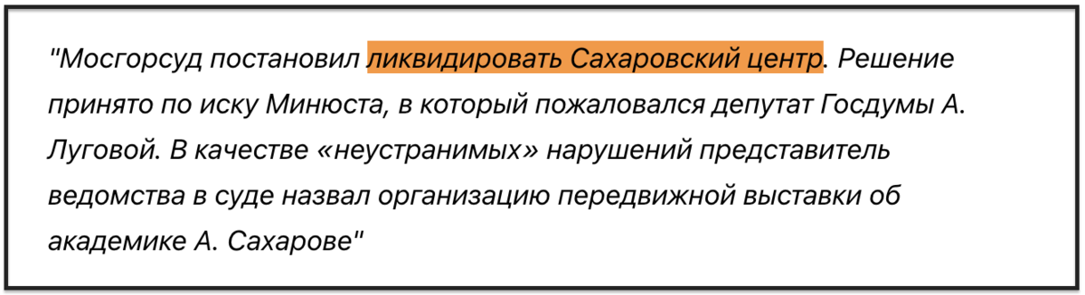 Некая формальность и не более, говорили они ... Но, как часто бывает в нашей стране, слова действующей власти расходятся с реальностью. С ликвидацией Сахаровского Центра мы открыли ещё одну страницу Истории жуткой реакции поглотившей нашу страну.