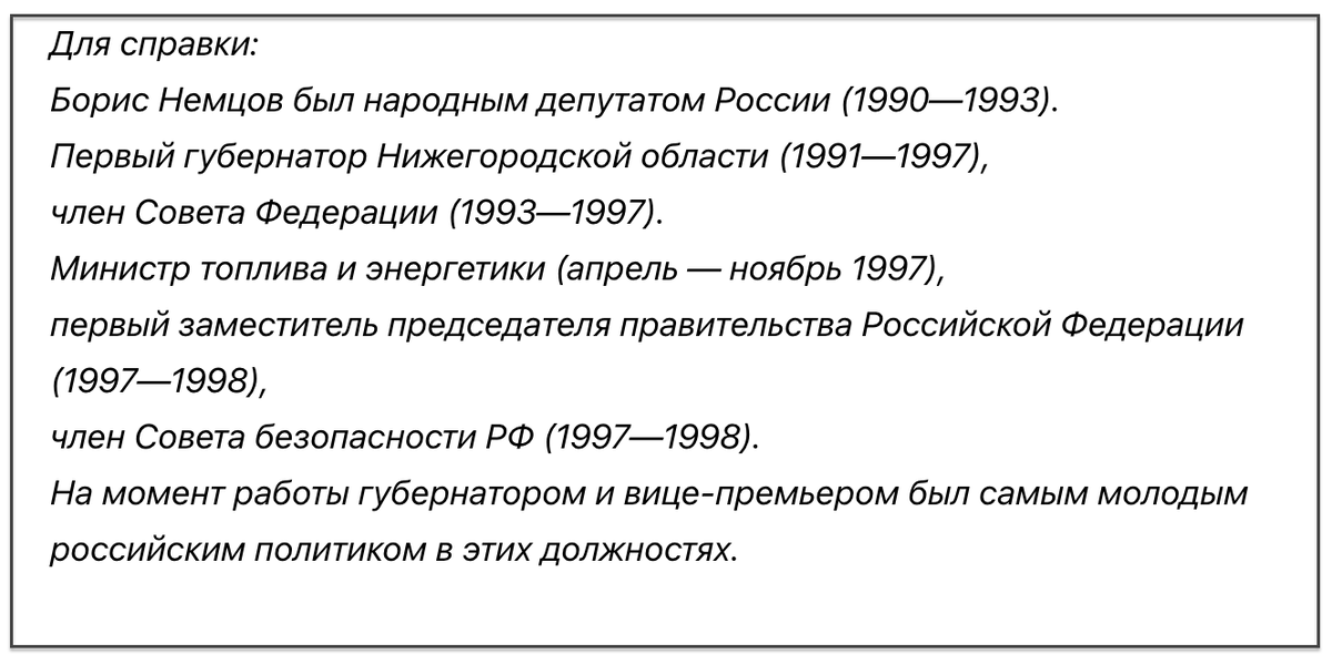 В 90-х годах, во времена правления Бориса Николаевича Ельцина, молодой прогрессивный политик Борис Немцов выступил с предложением пересадить российских чиновников всех уровней на отечественные автомобили. Аргументировав это тем, что пока чиновник ездит на прекрасном импортном автомобиле, он никогда не приложит силы для создания российского авто не уступающего импортному образцу.