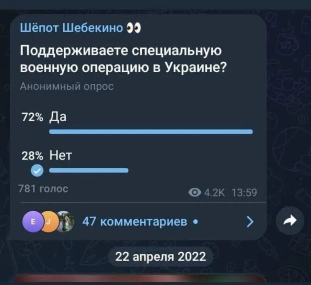 Говорят, глобальная сеть интернет помнит всё. Нашлась на его просторах и эта статистика в одной из групп общения местного населения. Не 146% , а всего 72% далёких от политики людей. Поверивших что их дом это никогда не посетит. В это верили и мы с вами. Верно? Интересно, как ответили бы эти люди сегодня? Изменили своё отношение к вопросу?