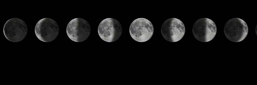 Луна показывает восемь фаз : новолуние, растущий полумесяц, первая четверть, растущая луна, полная, убывающая луна, последняя четверть и убывающая луна, а затем снова фаза новолуния.