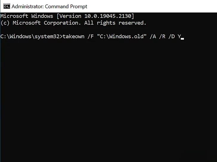 Примите право собственности на файл. Для этого введите takeown /F "C:\Windows.old" /A /R /D Y и нажмите Enter.