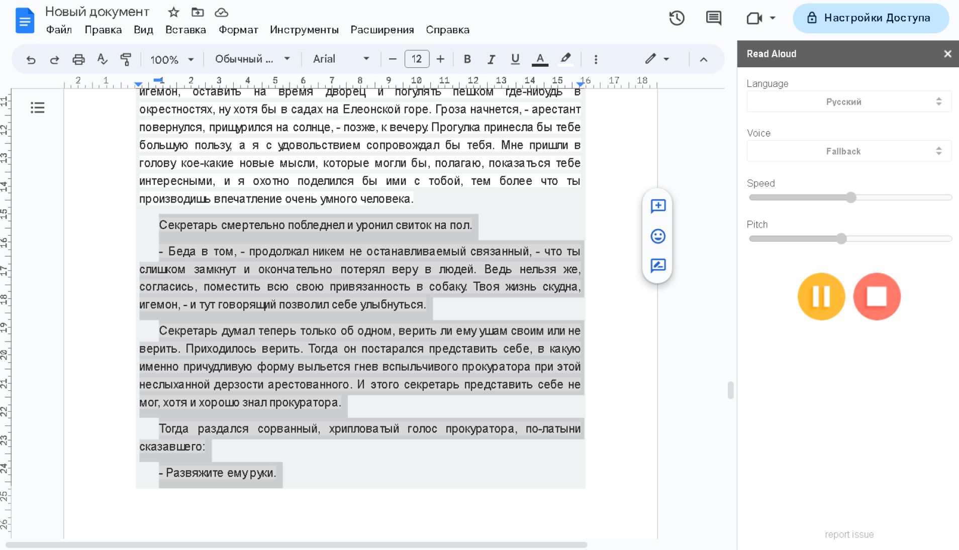 Расширение для прослушивания текста непосредственно из документа. Это, конечно, не аудиокнига, но для того, чтобы, например, составить представление о том, как будет звучать ваша речь (если вы готовите выступление), этого вполне достаточно. При запуске можно выбрать язык, скорость речи и голос чтеца.