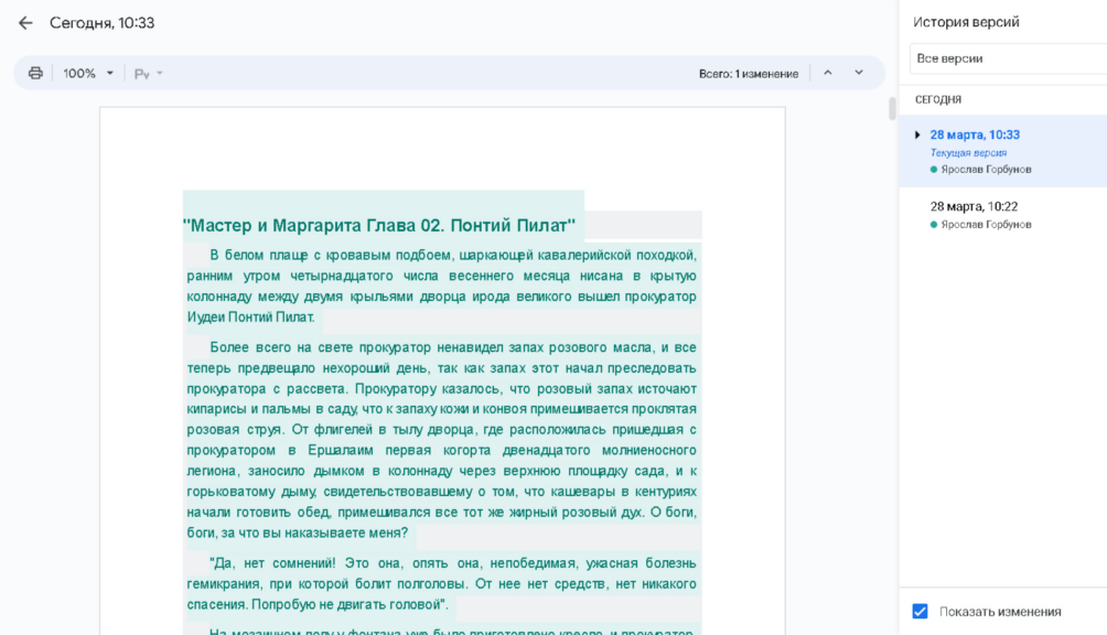 При совместной работе над текстом легко упустить из вида изменения, вносимые другими пользователями. Чтобы этого не произошло, воспользуйтесь функцией истории версий. Ее можно вызвать горячими клавишами Ctrl + Shift + Alt + H (Cmd + Shift + Opt + H на Mac) или через меню «Файл — История версий — Смотреть историю версий». Здесь вы увидите в хронологическом порядке все изменения, внесенные вами или другими пользователями, имеющими доступ к документу.