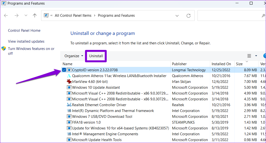 Шаг 2: Выберите проблемное приложение из списка и нажмите кнопку Uninstall в верхней части. Затем следуйте подсказкам на экране, чтобы удалить приложение с компьютера.