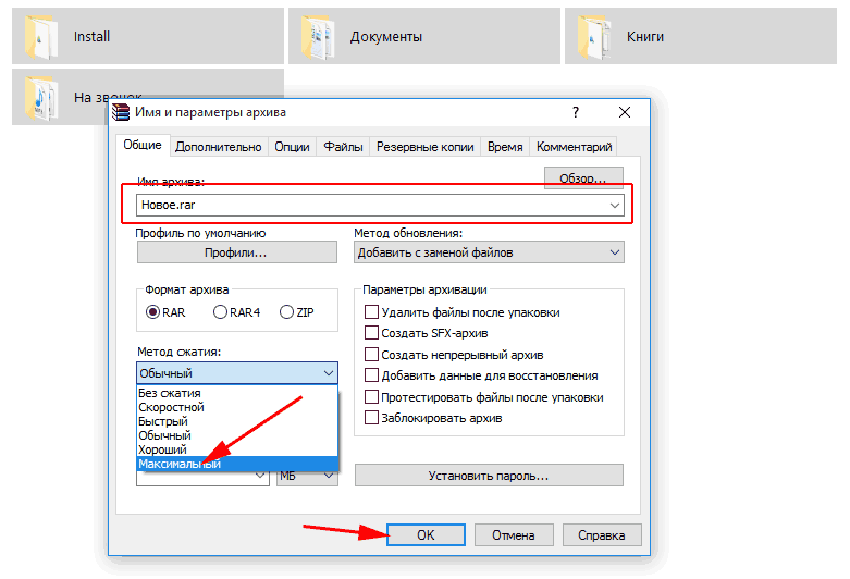 В появившемся окне программы, в красной рамке можно задать любое имя нашего будущего архива, а в пункте - Метод сжатия - можно выбрать - Максимальный. Программа будет создавать архив несколько дольше, но и размер будет меньше. Нажимаем - ОК.