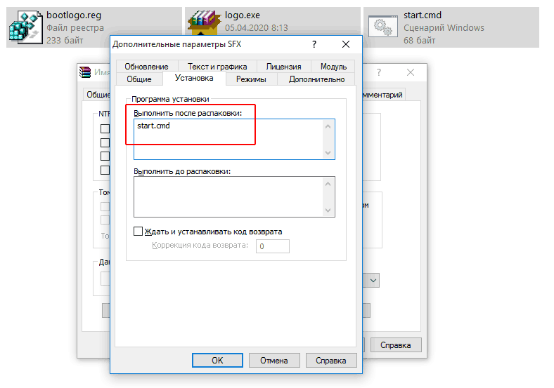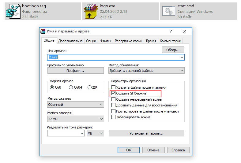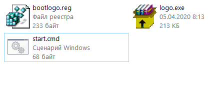 Итак, создаем папку, а в неё помещаем подготовленные заранее файлы. В нашем случае это рег-файл (файл реестра), самораспаковывающийся архив с логотипом (если кликнуть по нему, он извлечет картинку в C:\Windows\System32), а также пакетный файл, который запускает все эти установки.