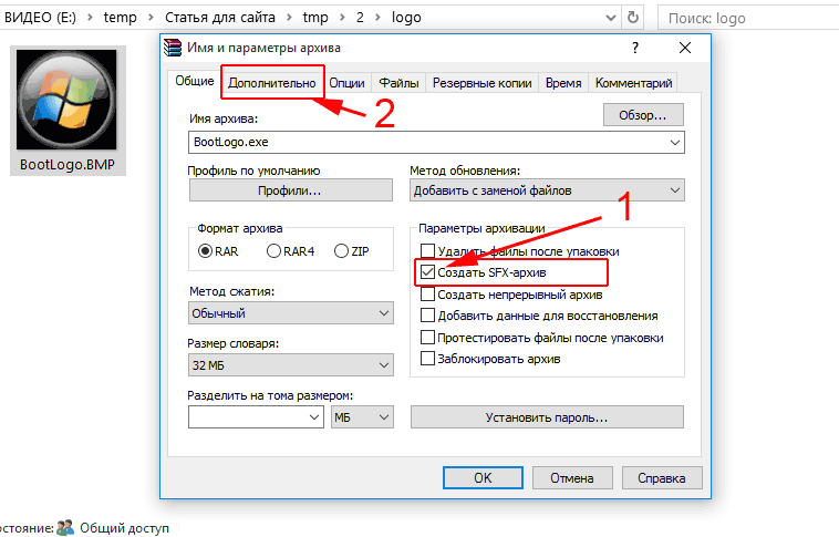 Если распаковать в отдельную папку sfx-архив - logo.exe - , то мы увидим обычную картинку. Давайте снова создадим sfx-архив, который мы распаковали. Для этого щелкаем правой кнопкой мыши по картинке и выбираем в контекстном меню команду - Добавить в архив. Ставим галочку на пункте - Создать SFX-архив. Переходим в раздел - Дополнительно.