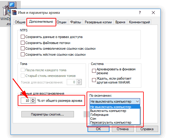 Галочку поставили, теперь переходим в раздел - Дополнительно. Тут вам нужно указать размер в процентах данных для восстановления от общего размера архива. В принципе достаточно и 5%, но можно поставить и больше. Только не забывайте что и файл архива получится побольше. Если процесс сжатия долгий, например вы архивируете папку с установочными файлами игры, то вы можете выбрать справа что делать по окончании процесса архивации. Можете выбрать пункт - Выключить компьютер - и идти заниматься своими делами. После завершения работы винрар сделает корректное выключение системы.