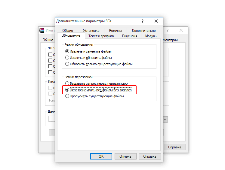 Тут щелкаем по пункту - Параметры SFX... . Появится еще одно окно, во вкладке - Общее / Путь для распаковки - прописываем место куда полетит наша картинка. На скриншоте прописан путь - C:\Windows\System32, но на практике лучше прописывать переменные, таким образом - "%SystemRoot%\System32" - двойные ковычки желательны. Делается это для того, чтобы файл с гарантией прилетел в системную папку. Иногда буква системного диска может быть не - C: - , а любой другой. После того, как прописали путь, переходим на вкладку - Режимы.
