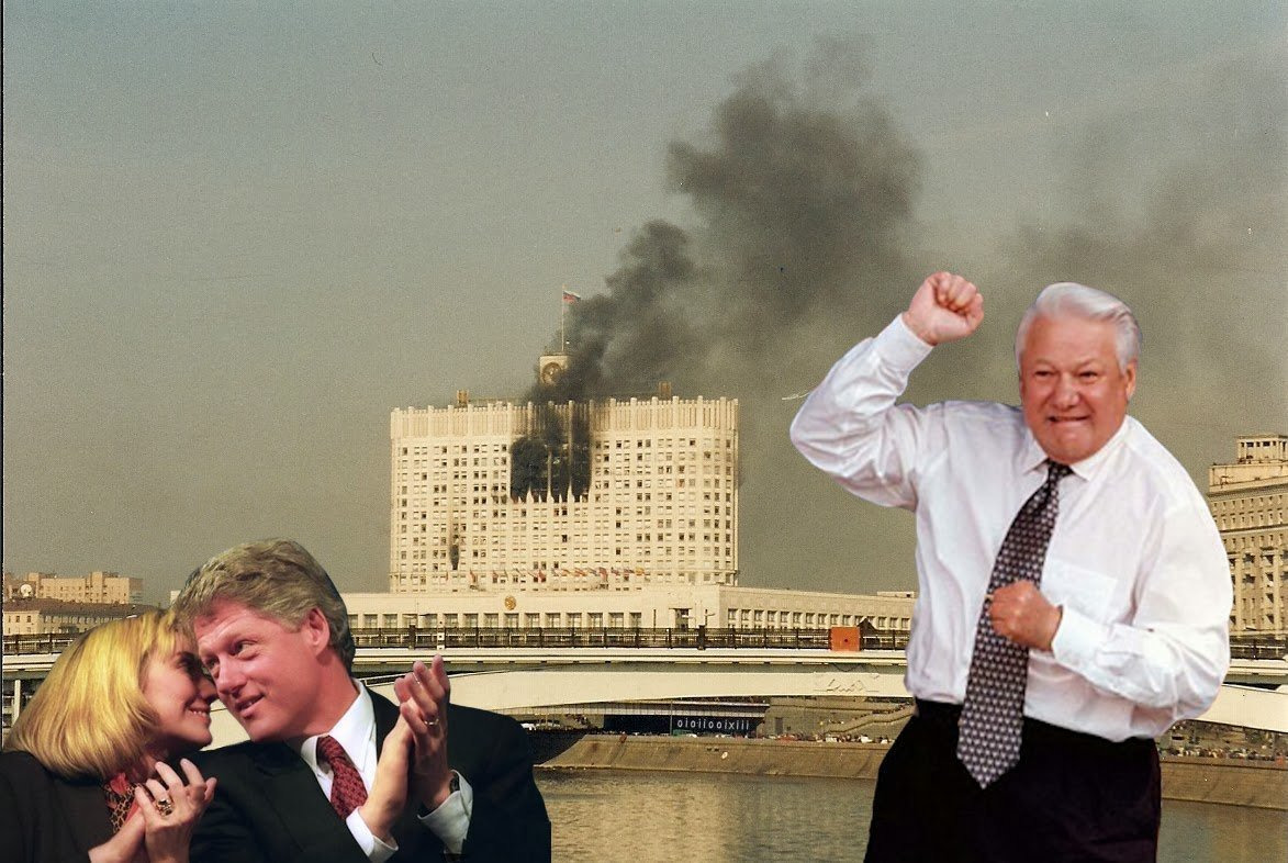 1993 – американцы помогают Ельцину провести расстрел нескольких сотен людей при штурме Верховного Совета. Упорно ходят неподтверждённые слухи об американских снайперах, помогавших в борьбе против «красно-фашистского переворота». Кроме того, американцы позаботились о победе Ельцина на следующих выборах, хотя за несколько месяцев до них его поддерживало всего 6% россиян.