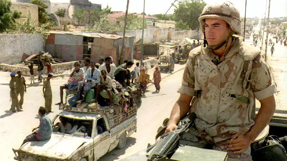 1992-1994 – оккупация Сомали. Вооружённое насилие над мирным населением, убийства гражданских лиц. В 1991 году был свергнут президент Сомали Мохаммад Сиад Барр. С тех пор страна фактически разделена на клановые территории. Центральное правительство не контролирует всю территорию страны. Официальные лица США называют Сомали «идеальным местом для террористов». Тем не менее, некоторые предводители кланов, например, покойный Мохаммад Фарах Аидид сотрудничал с миротворцами ООН в 1992 году. Но недолго. Уже год спустя он стал с ними воевать.