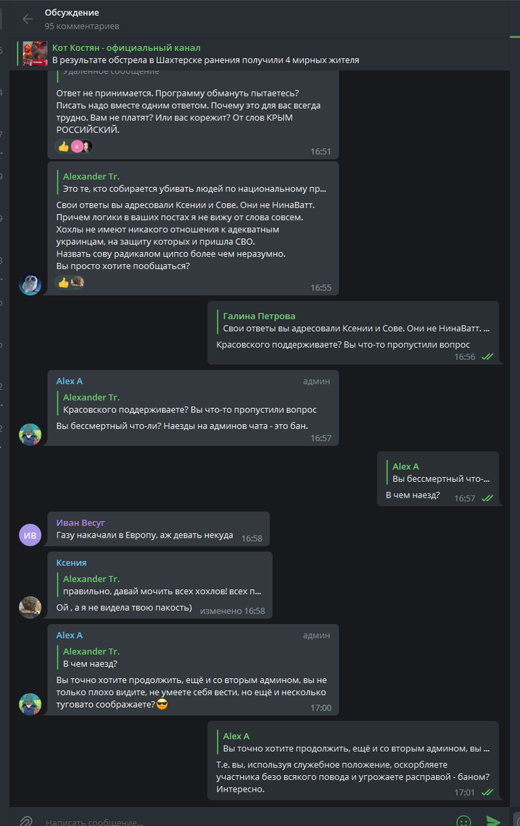 На что местный админ Галина Петрова возбудилась (надеюсь, только в голове) и в весьма вульгарной форме начала мне высказывать претензии и (тадааам!) в лучших традициях укронацистов спросила "чей Донбасс"?