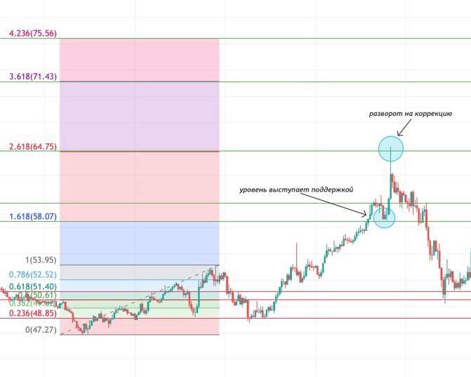 С помощью этого инструмента можно определить и окончание коррекции, и зоны, в которых вероятнее всего завершится основное движение.