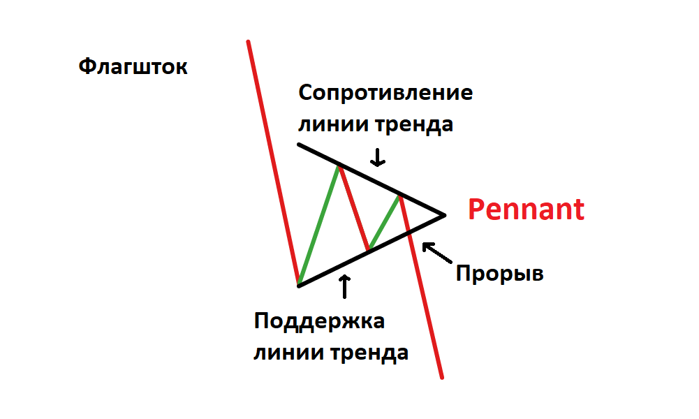 - При паттерне вымпел восходящий или нисходящий тренд продолжается.