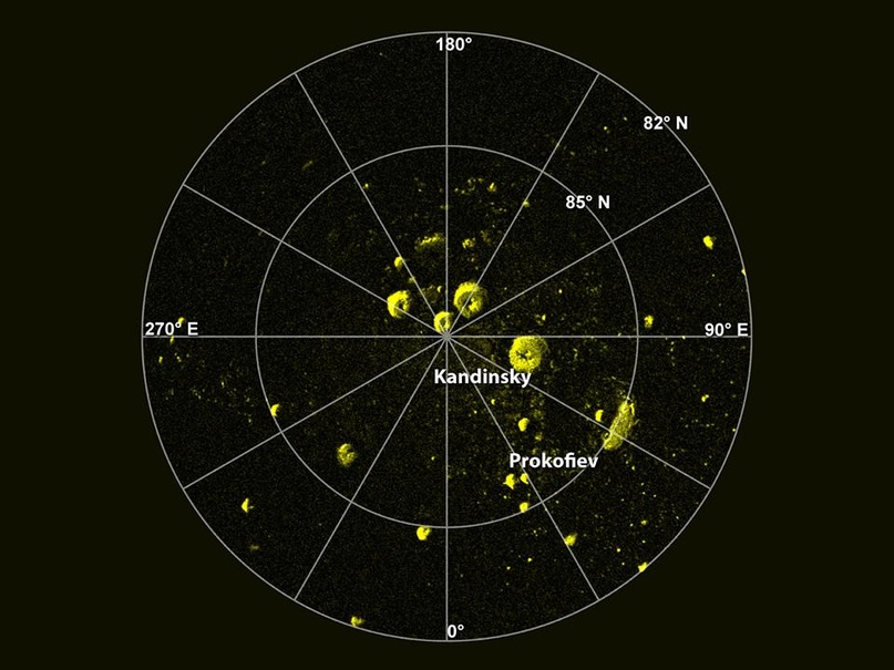Снимок обсерватории Аресибо северного полюса Меркурия. Желтыми пятнами обозначены области высокого коэффициента отражения. Одна из гипотез гласит, что это скопление льда
