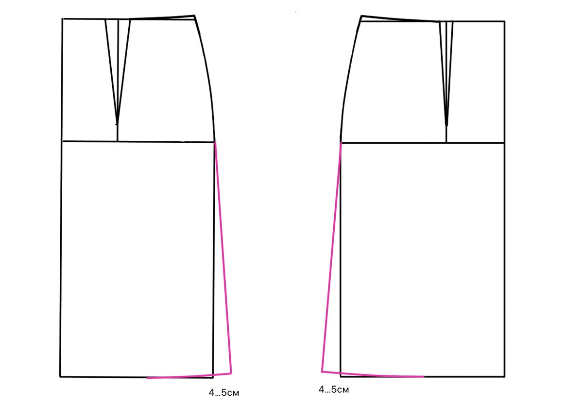 1. По боковым линиям снизу добавляем расширение по 4...5см. Соединяем эти точки прямыми линиями с точками линии бёдер. Выравниваем низ, таким образом чтобы сбоку был угол 90 градусов.