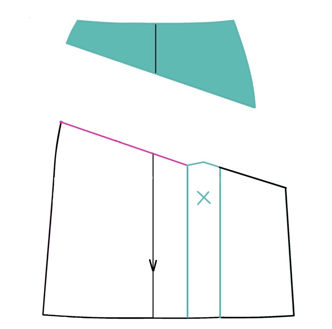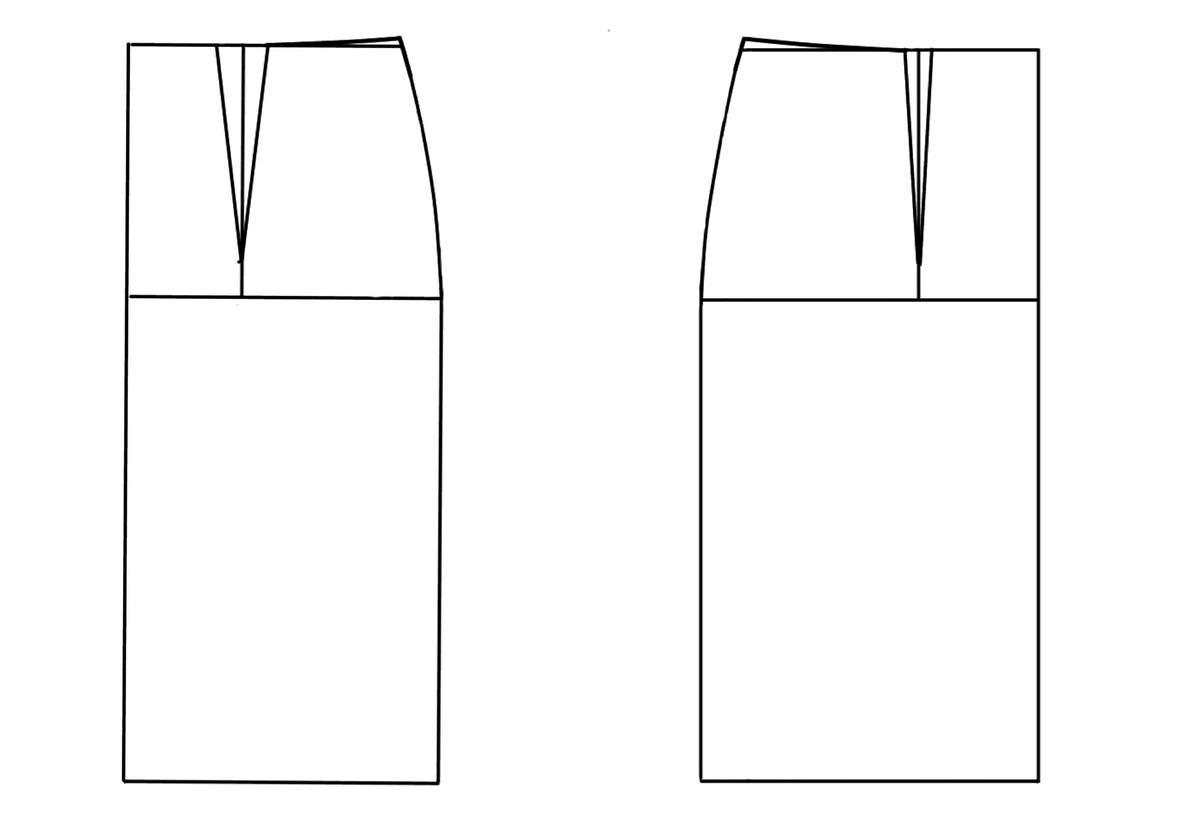 2. Задняя половинка юбки готова. Переднюю половинку разворачиваем, чтобы получилось цельное полотно. Закрываем вытачки и оформляем линию кокетки.