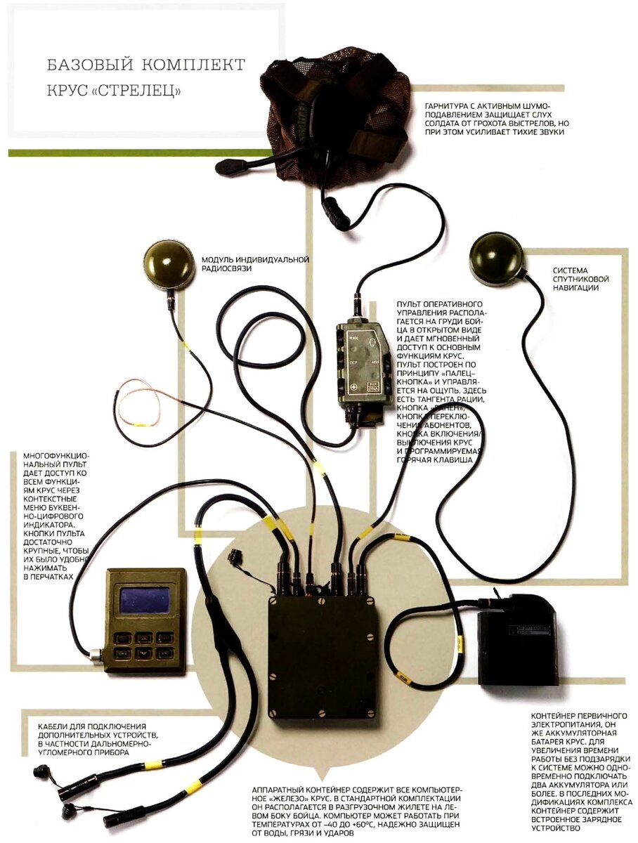 Я перечислил только основные задачи, на основании которых можно оценить возможности КРУС «Стрелец», которые делают каждого бойца первоначальной боевой информационной единицей большой АСУВ, способной работать с боевой информацией как в интересах собственного подразделения, получая установки и поправки для стрелкового оружия, так и в интересах других подразделений (авиации, артиллерии) - передавая высокоточную информацию целеуказания для огневых средств поражения. При этом то, что видит отдельный боец оснащённый КРУС, может видеть и военачальник, находящийся за сотни и тысячи километров от места боевых действий.
