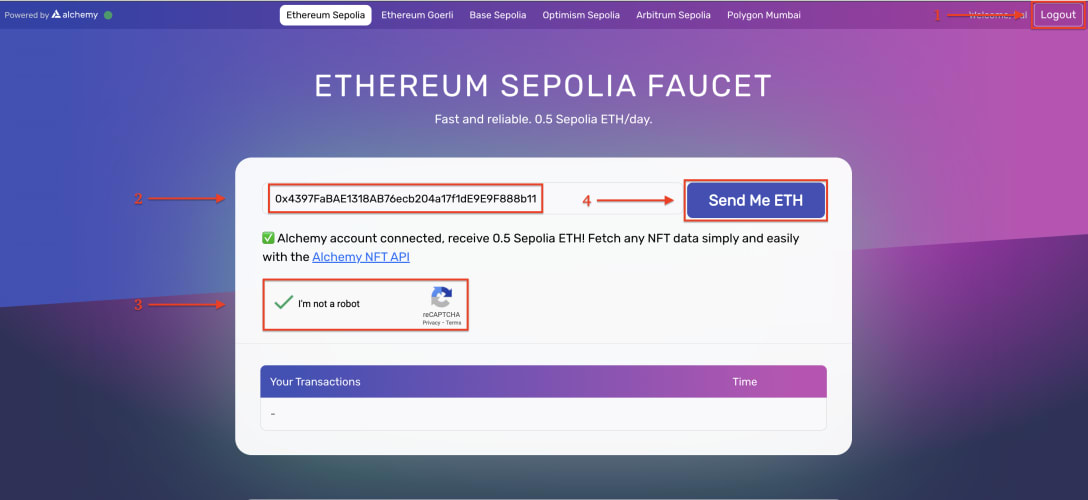 - Visit the Alchemy Faucet, specify your wallet address and click “Send me ETH”.