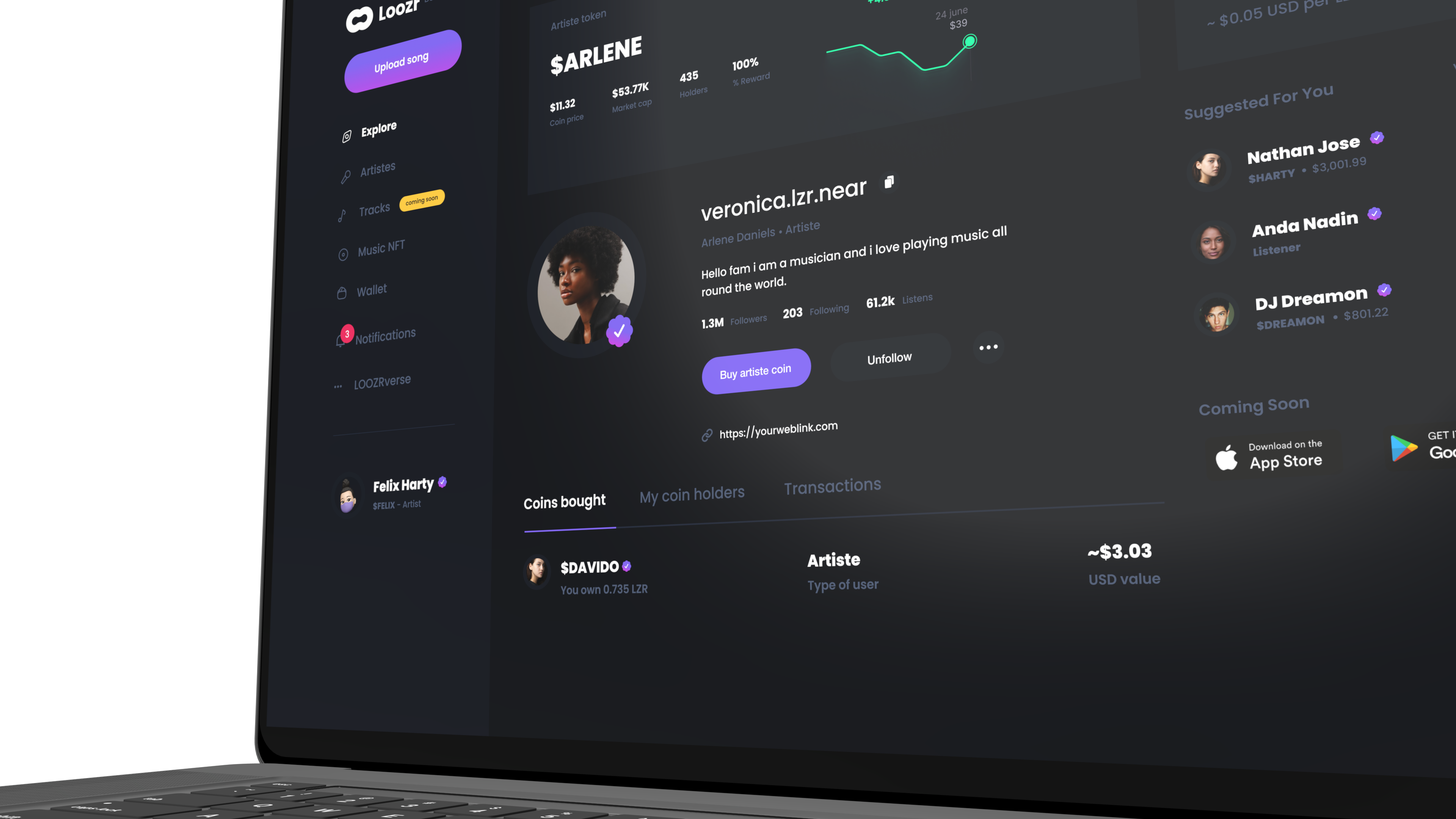 Loozr, like Spotify or SoundCloud, is a music streaming platform for everyone; however, creators, artistes, celebrities, upcoming musicians, and labels can launch their own Song and Profile tokens directly on the blockchain.
