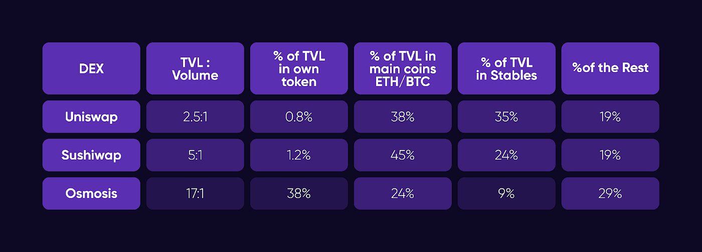 It is important to remember that AMMs, such as Osmosis for Cosmos, usher in a new wave of utility within DeFi ecosystems and become ever more important as the TVL continues to grow. This growing TVL, facilitated by Osmosis, poses other challenges such as low volume in correlation to TVL and low percentage of TVL in stablecoin strategies compared to popular AMMs like Sushiswap and Uniswap.
