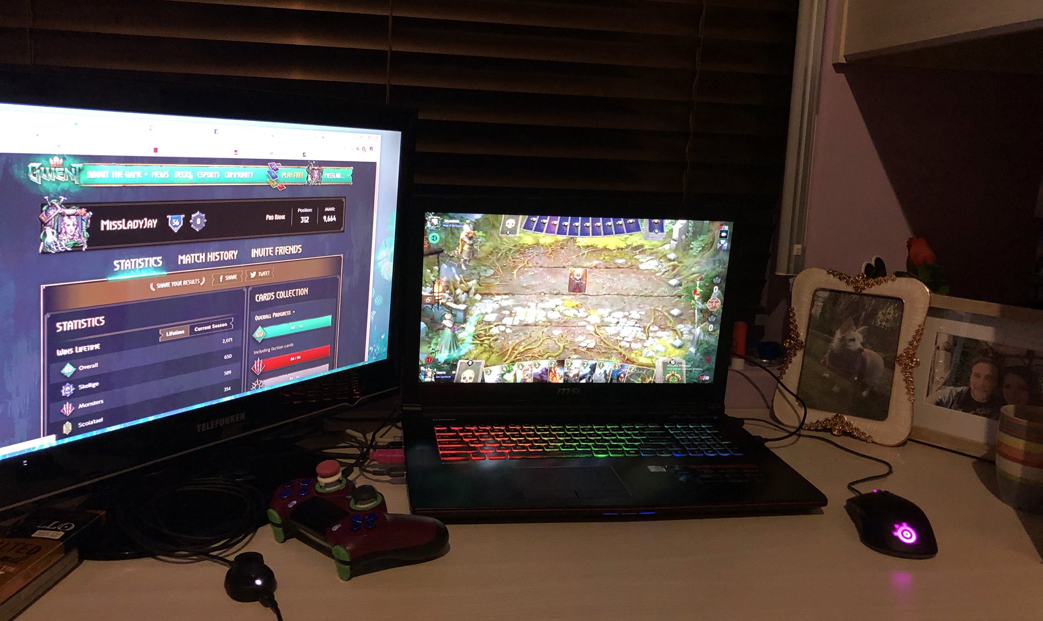 Начала стримить после первого года работы, когда ОБТ Гвинта вышла на PS4. Поначалу стримила с консоли, но потом друг подарил ей ноутбук, и закрытие игры на консолях никак не сказалось на прогрессе ее аккаунта.