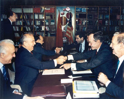 После создания Фонда Горбачев совершил поездку по США, где выступал перед многочисленными аудиториями, заявляя, что с падением СССР мир вступил на качественно новую ступень развития. Разрушение Российской цивилизации ознаменовало победу новой глобальной цивилизации. Происходит замена старой парадигмы исторического развития на новую. Горбачев встретился с президентами США Д. Бушем, Р. Рейганом, Д. Картером, Р. Никсоном, бывшим госсекретарем США Д. Шульцем. На встрече с президентом Рейганом Горбачев заверил его, что сделает все для достижения »новой интегрированной глобальной цивилизации», управляемой из одного центра. По-видимому, именно на этих встречах были в основном определены задачи и этапы создания единого мирового правительства и полного подчинения человечества руководителям иудейско-масонской цивилизации.