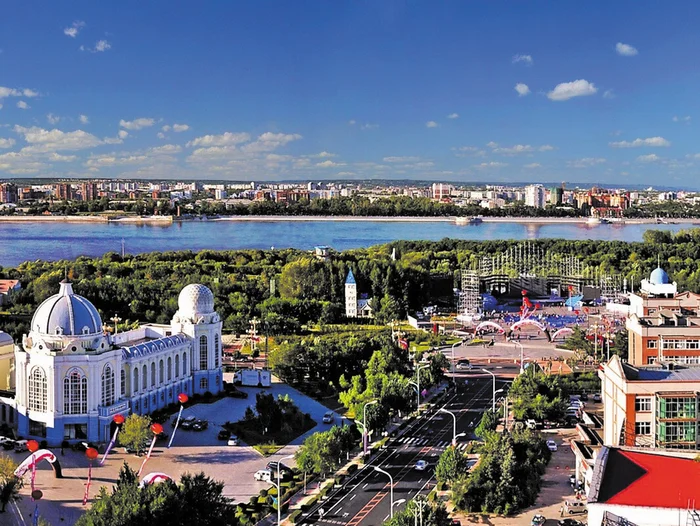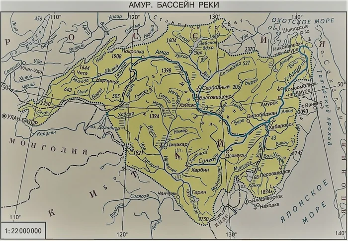 Амур начинается на границе Забайкальского края России и Китая, потом течёт на восток, впадая в Тихий океан.