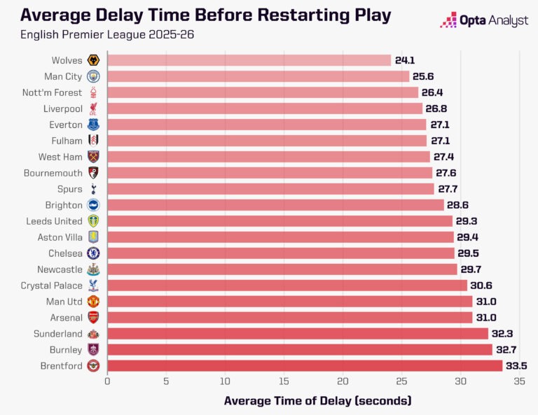 Если говорить о цифрах, то «Кристал Пэлас» (41,6 секунды) и «Брентфорд» (41,0 секунды) тратят больше всех времени в среднем на исполнение штрафных ударов, тогда как «Фулхэм» (25,8 секунды), «Брайтон» (26,8 секунды) и «Ливерпуль» (26,9 секунды) делают это быстрее всех.
