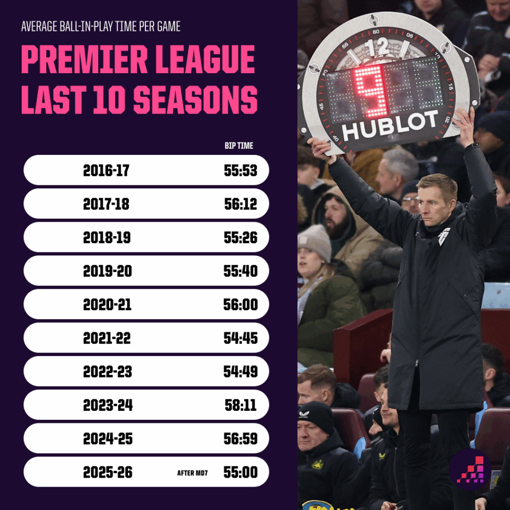 Мяч находится в игре в среднем лишь 54,7% времени матчей Премьер-лиги в этом сезоне; при этом самый низкий показатель за последние 10 полных сезонов составлял 55,7% — и это было в 2022/23.