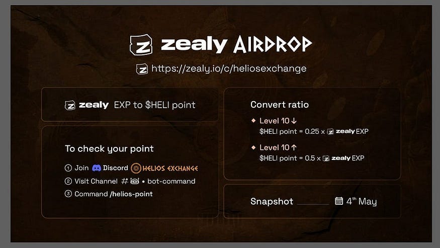 У всех участников Helios Zealy будет шанс заработать наш аирдроп. Ваш опыт за выполнение квестов на нашем Zealy будет конвертирован в очки HELI следующим образом: